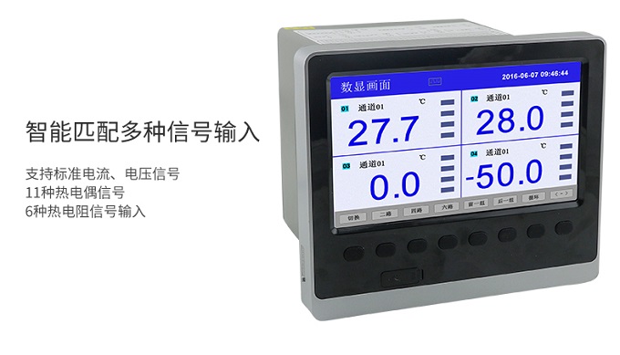 SIN-R6000C系列彩色無紙記錄儀48路(萬能輸入(可組態選擇輸入:標準電壓、標準電流、熱電偶、熱電阻、頻率、毫伏等)。可帶18路報警輸出,12個變送輸出,RS232/485通訊接口,以太網接口,微型打印機接口和USB接口,SD卡插座;可提供傳感器配電;具有強大的顯示功能,實時曲線顯示,歷史曲線追憶,棒圖顯示,報警列表顯示。人性化的外觀設計、良好的功能體現、可靠的硬件品質、精湛的制造工藝,使SIN-R6000C具有更高的性能價格比。